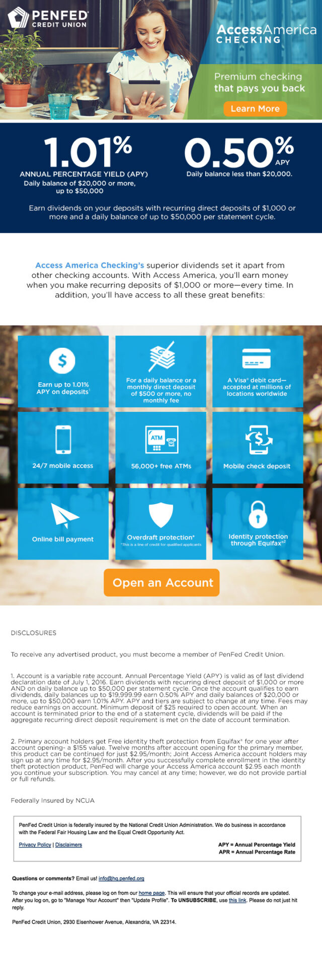 Designed and email from scratch for PenFed’s Access America Checking product. This email was also coded and set up for all mail platforms. This is a new design ready to be tested with the current campaign that is running. This is a new concept to cater to member’s needs. The design still caters to PenFed’s branding guidelines.